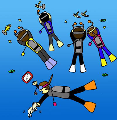 マクロ好きダイバーにはたまらない『ユタポイント』。 ヒレナガネジリンボウを始め、メタリックシュリンブゴビー、マスクドシュリンプゴビー等々。 まさに、ハゼパラダイス。 みんなは、それぞれお気に入りの子を撮影している。 その間、美人ガイドYは次から次へとおさかなを見つけてきてくれる。 だから、巣穴にへこましてしまっても、へっちゃら。(^^)v そんなサービス満点の美人ガイドY、みんなにカラッパを見せようと手を伸ばした瞬間…。 イテテテテ!!指を挟まれた。 なのに誰も心配することなく、ずっとお気に入りの子を撮り続けていた。 Y子さん、ゴメンネ! |