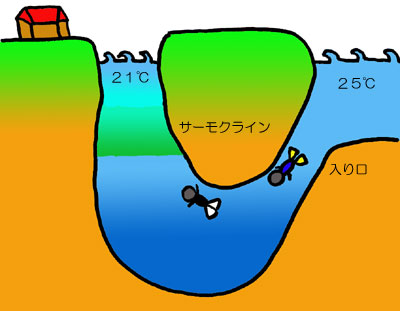 宮古島といえば、『通り池』。 入り口から眺める通り池は、イラストとは違いかなり大きく、なんだかジンベエザメの口のような感じ。 そのまま、ジンベエに吸い込まれると、サーモクラインがとてもきれいな世界に。!(^^) しかし、温暖な生活に慣れたプランクトンたち(僕たち)にとっては、とても寒いところだった。